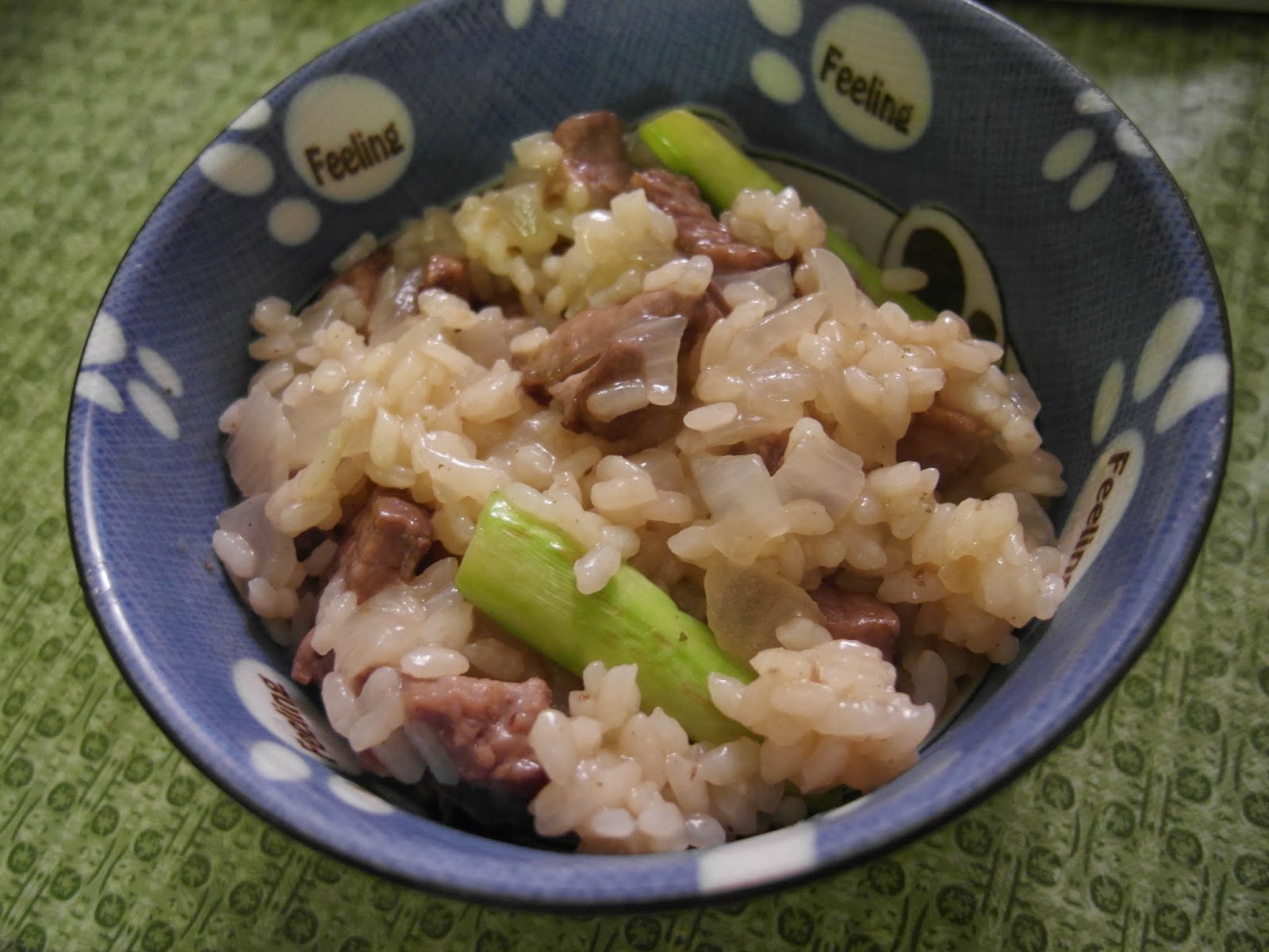 看看冰箱還有上一餐沒吃完的牛排, 就把他們切小塊加進去啦,